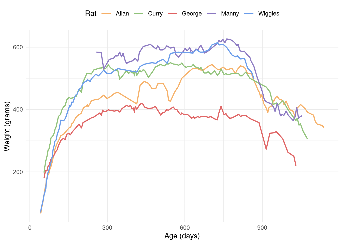 It’s possible to recreate this in a more robust way using R with tidyverse and lubridate. First, I gather all the weighings as separate data points by date, ignore the ones that don’t have a reading, and calculate the age of the rat in days for that weighing.