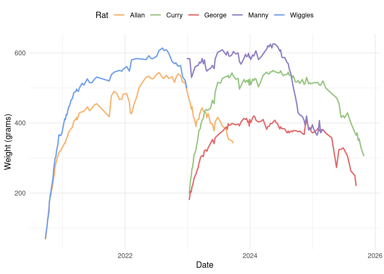 I tracked how much each rat weighed on a regular basis as recommended by the RSPCA.1 While there isn’t a universal ‘healthy weight’ across rats, the Isamu line for example typically fall in the 500-650g range when fully grown.2 As part of monitoring for sudden changes, it’s helpful to visualise this data.